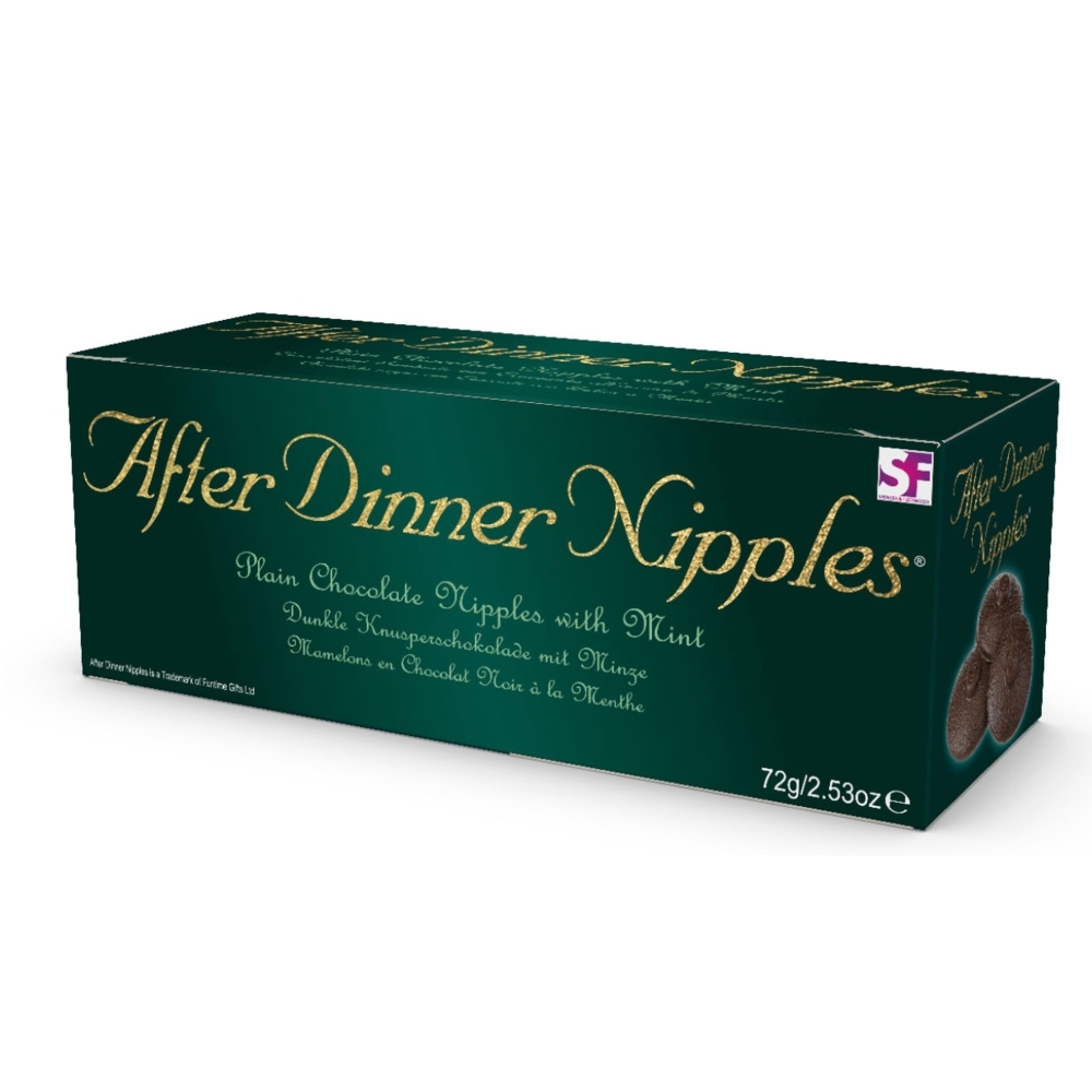 The After Dinner Nipples are a playful twist on classic after-dinner treats. This novelty box contains 8 smooth plain chocolate nipples, each filled with a refreshing hint of mint. Perfect for parties, gifts, or just a bit of cheeky indulgence, these chocolates are sure to raise eyebrows and smiles alike.